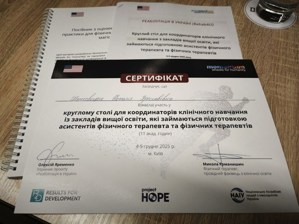Викладач кафедри фізичної терапії, ерготерапії Наталія Штоковецька взяла участь у круглому столі для координаторів клінічного навчання, які відповідають за організацію практичної підготовки асистентів фізичного терапевта та фізичних терапевтів. Захід відбувався 4 і 5 грудня 2025 року в Києві в межах міжнародного проєкту «Реабілітація в Україні» (Rehab4U) за підтримки Momentum Wheels for Humanity. Подія об’єднала представників різних закладів вищої освіти, які координують клінічну практику зі спеціальності Терапія та реабілітація.